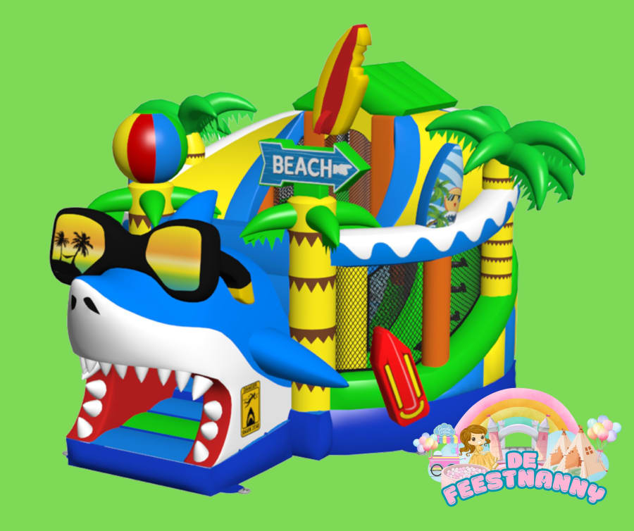 Maak je feest extra zomers met het speelse springkasteel Sharkie! Dit vrolijke strandthema — met een coole haai met zonnebril, strandbal, palmboompje en frisse beach-vibes — zorgt meteen voor een zonnige sfeer en blije gezichtjes.