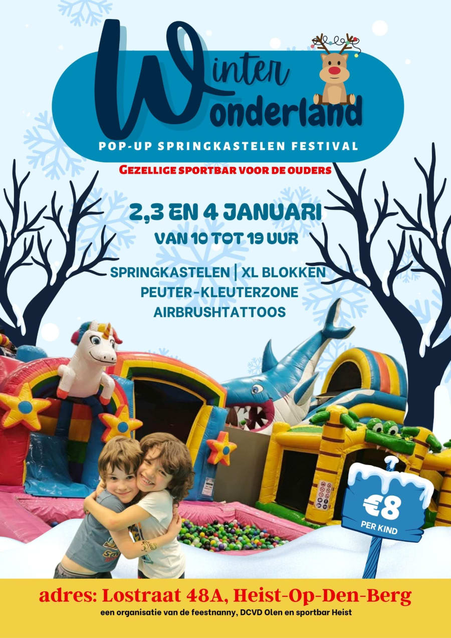 Van 2 tot en met 4 januari is het weer tijd voor winter wonderland in de sporthal van Heist-op-den-Berg! Drie dagen lang kunnen kinderen zich uitleven op verschillende springkastelen en genieten van eindeloos speelplezier.