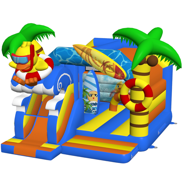 Ontdek ons schattige en superleuke springkasteel eendje — dé vrolijke blikvanger voor elk kinderfeest! Dit speelse badeendje in een zwembandje zorgt meteen voor zomerse sfeer en brede glimlachen. Binnenin kunnen kids ravotten op het surfbordje, terwijl het palmboompje vooraan het geheel een heerlijk vakantiegevoel geeft.